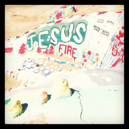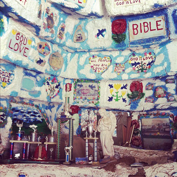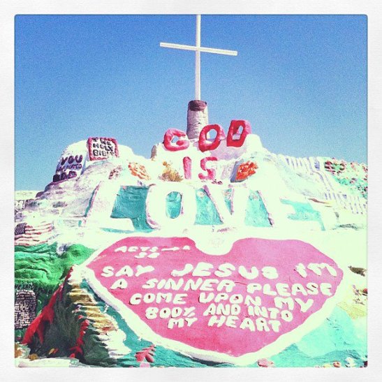 My southern California adventures continued yesterday with a trip to National Folk Art Site Salvation Mountain. Built by Leonard Knight on the outskirts of Niland, California, the message is simple: God is Love. These words are painted dozens of times on the giant kaleidoscopic mountain that Leonard has dedicated his life to creating. His interpretation of the Bible is equally simple: accept Jesus into your heart, repent your sins, and be saved.