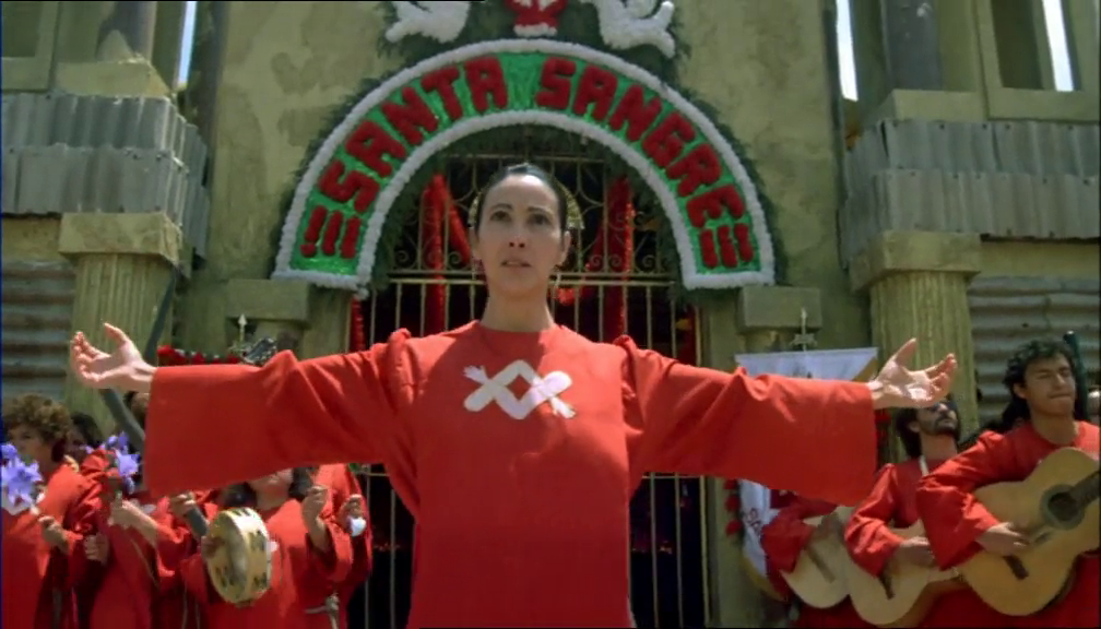 Likewise, most of Santa Sangre deals with characters engaged in similar debauchery or revelry- cocaine, prostitution, tattooing, dancing, fighting, hallucinating, and other alternatives to “reality.” Paz explains such actions saying, “The explosive, dramatic, even suicidal manner in which we strip ourselves, surrender ourselves, is evidence that something inhibits and suffocates us. Something impedes us from being. And since we cannot or dare not confront our own selves, we resort to the fiesta. It fires us into the void; it is a drunken rapture that burns itself out, a pistol shot in the air, a skyrocket.” Perhaps Jodorowsky had similar ideas about the human condition: people lead mostly lonely and meaningless lives, and transgression is essentially a form of rebellion against that vacuity and solitude.