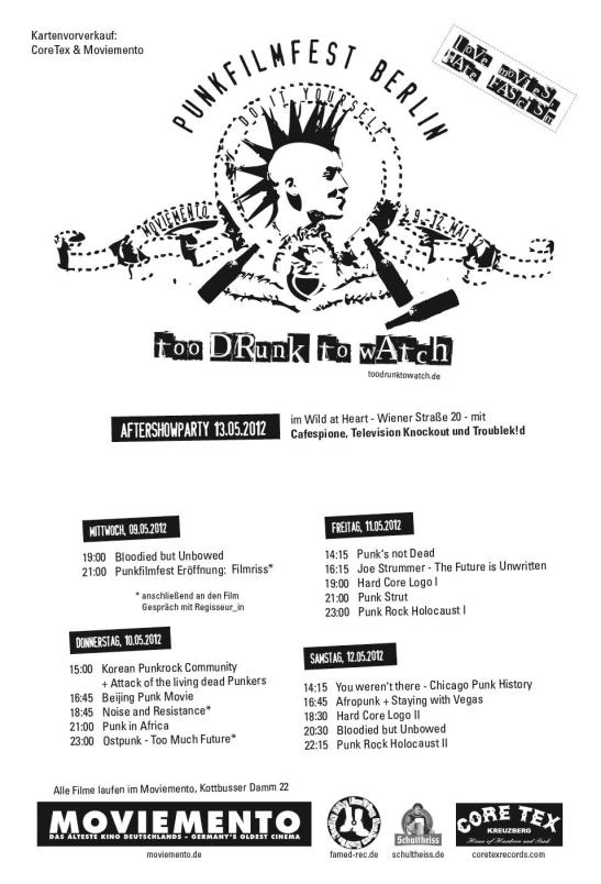 It almost worked out very fine, just the last movie I wanted to show didn’t reached the cinema in time. We will show it next year. I’m more than happy and I already have booked the cinema for 2013. The second Berlin Punkfilmfest will be held from 9th – 12th May at the Moviemento (Berlin, Kreuzberg).