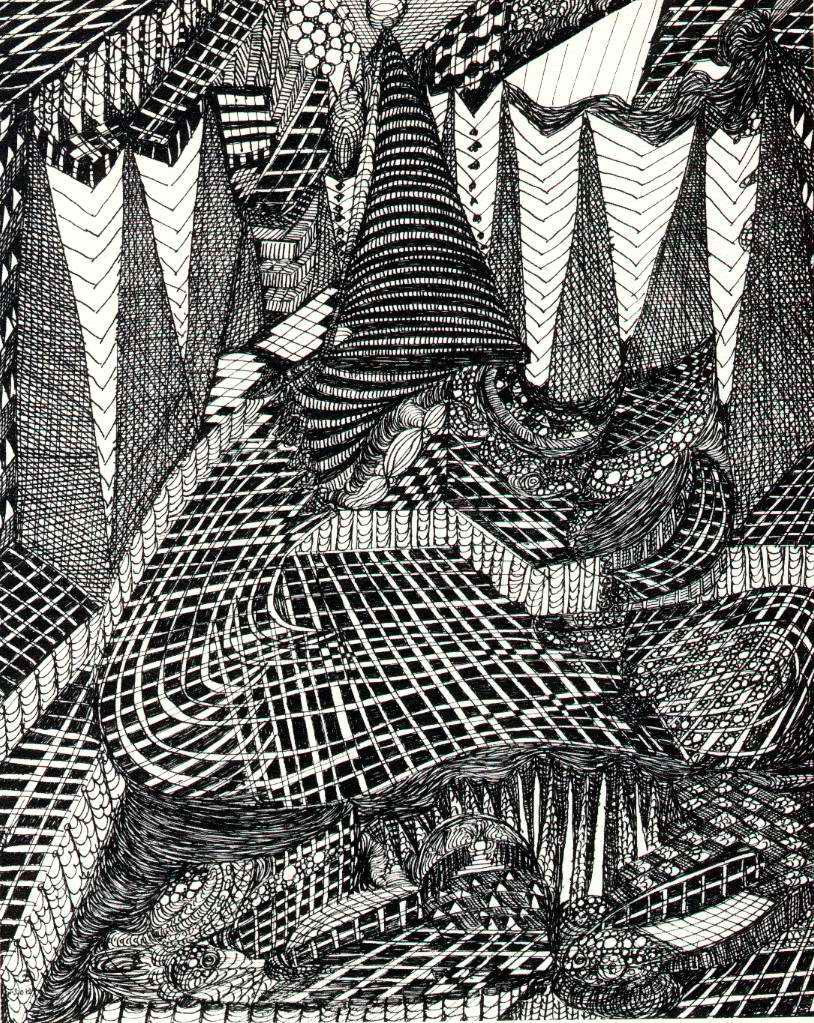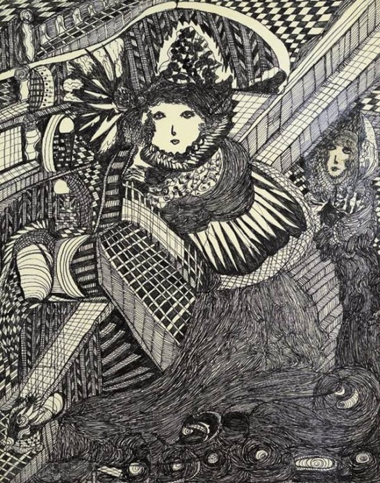 That said, Madge Gill is a quintessential outsider artist. An eccentric English lady and prolific illustrator, Gill produced thousands of pen and ink drawings over the course of her life. She worked as a spiritual medium in her town, and would fall under a delirious sort of trance when she worked. According to Gill, her artistry was a result of her channeling Myrninerest, her personal spirit guide. She was said to turn down her one opportunity to show at a small exhibit, claiming that all of her drawings belonged to Myrninerest, and thus could not be sold.