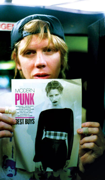 Love it or hate it, these jackets are becoming increasingly mainstream though. Folks are putting their own spin on them, which unfortunately, is often a “high fashion” spin. There’s also the trend of them being mass-produced and made to LOOK DIY even though they’re actually cookie-cutter versions. Thurston Moore called that shit with 1991’s “The Year Punk Broke” and this sad photo of him holding an image from “punk” fashion editorial: