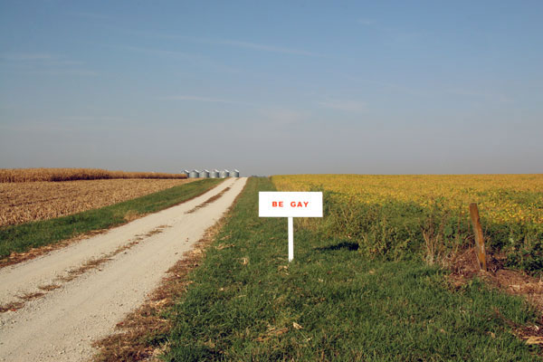 “This road [in rural Illinois] doesn’t get much travel. I use [it] for bike rides because, in the course of a 14- or 15-mile ride, I usually only encounter one vehicle. On a recent early- afternoon ride, a pickup truck came up behind me, and, as I typically do, I pulled my bike over into the grass so they could go by. As the truck passed me, someone in the cab threw a beer can in my direction and yelled out the open window. The profanity he used suggested the truck’s occupants were confused about my sexual orientation, and this confusion had clearly made them angry. I built and painted the sign the next day and then placed it at the spot where my new friends had tried to offer me a beverage. It was still standing the next morning as I made my way to work, but by Monday night it had been knocked down. It’s now resting comfortably on the floor of my shed.”