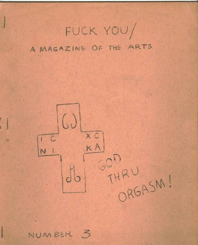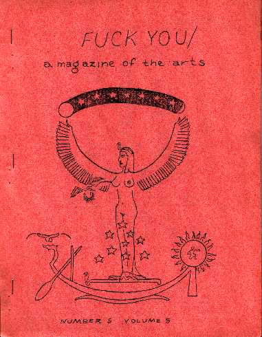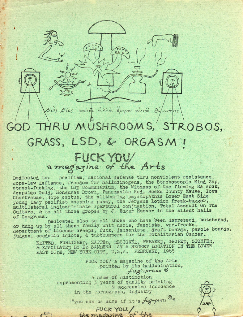 Story of my life: I sit down at my computer hell-bent on completing some academic reading (I’m a grad student, after all!) and next thing I know, it’s 3 hours later, and I discover I’ve wasted appropriately spent all that time on something INFINITELY BETTER than academic readings. I present, Fuck You: A Magazine of the Arts. Published from 1962-1965 and edited by Ed Sanders (yeah, that Ed Sanders) the philosophy behind the literary journal was, “I’ll print anything.”