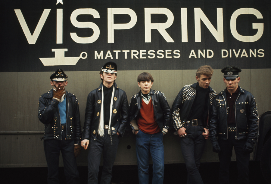 [James P. Blair- Motorcycle club members wear studded leather jackets and rakish caps in London, England, June 1966.]