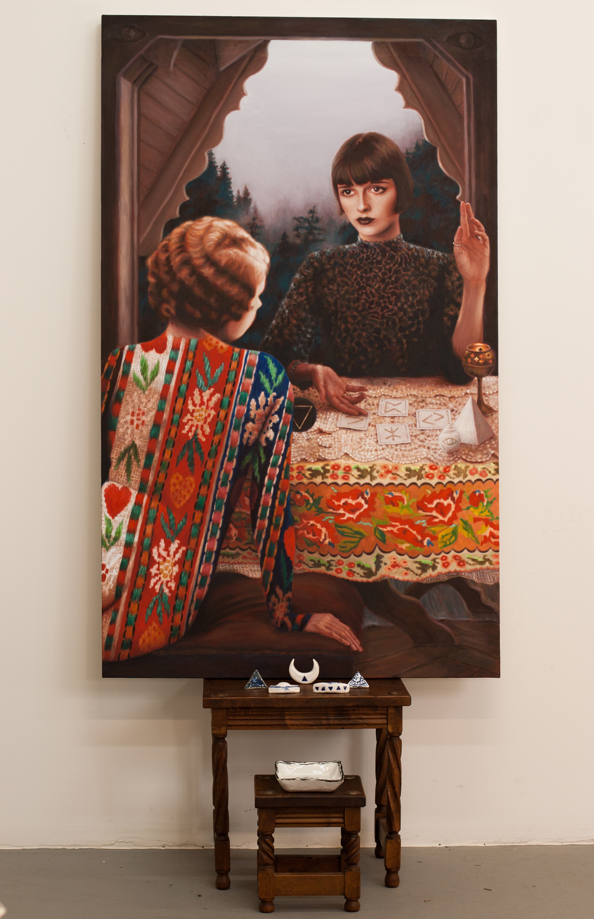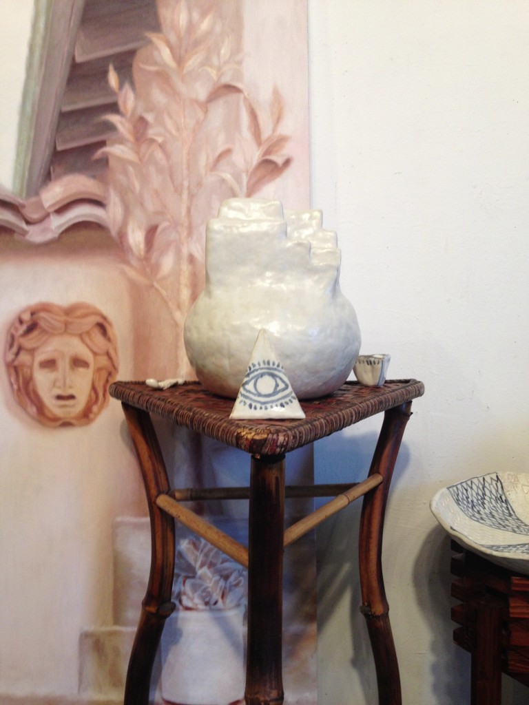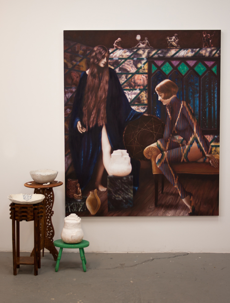 Alison: I wanted to try to bring the world in the paintings out into our world. For me, the objects function as artifacts from the story—almost like proof that it happened. And having the ceramics in the room kind of magnifies the energy in the paintings.