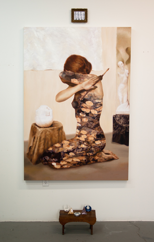 The story has similarities to a creation myth, so I started experimenting with installing the work in ways that reference altars in front of religious paintings. The ceramic sculptures in front of them are like sacred objects placed as offerings in front of the scene in the painting. The painting in my piece called The Hand of the Philosopher rests on a small table, inspired by the predellas used in Italian altarpieces in the 1400’s. Ceramic or canvas wall hangings above the paintings reference the painted scrolls that sometimes frame the top of altarpieces.