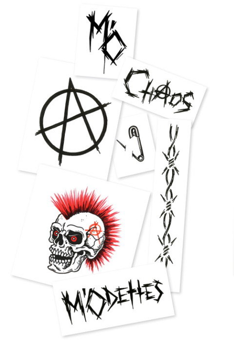 [Probably my favorite of them all: these completely idiotic fake tattoos. There are so many issues, the main one being: What’s with appropriating the Mo-dettes? Also, that ugly mohawked clip-art skull thing is the best. $95.]