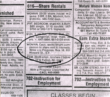[Want Ad, San Francisco Progress, 1974.]