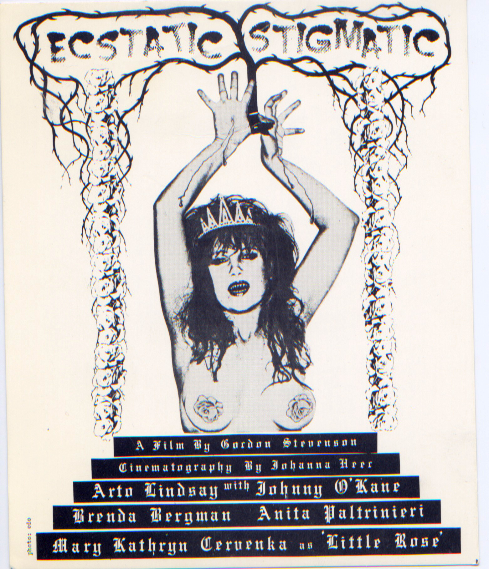 [Promotional postcard, “Ecstatic Stigmatic, A Film by Gordon Stevenson; Cinematography by Johanna Heer; Arto Lindsay with Johnny O’Kane, Brenda Bergman, Anita Paltrinieri; Mary Kathryn Cervenka as Little Rose,” 1980.]
